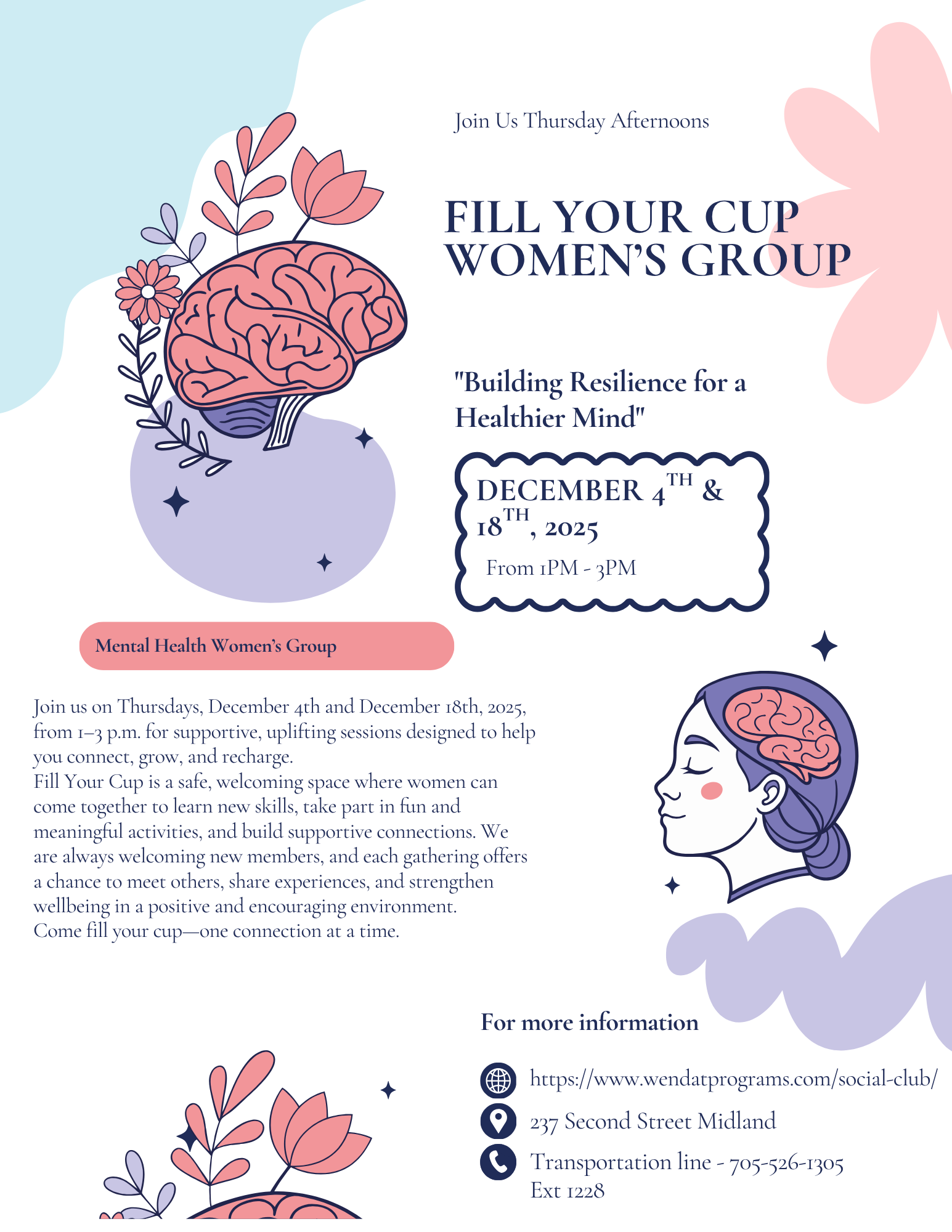 … is located on the lower level of Wendat Community Programs at 237 Second Street in Midland. The Social Club provides programs enhancing social, physical, emotional and cognitive wellness.