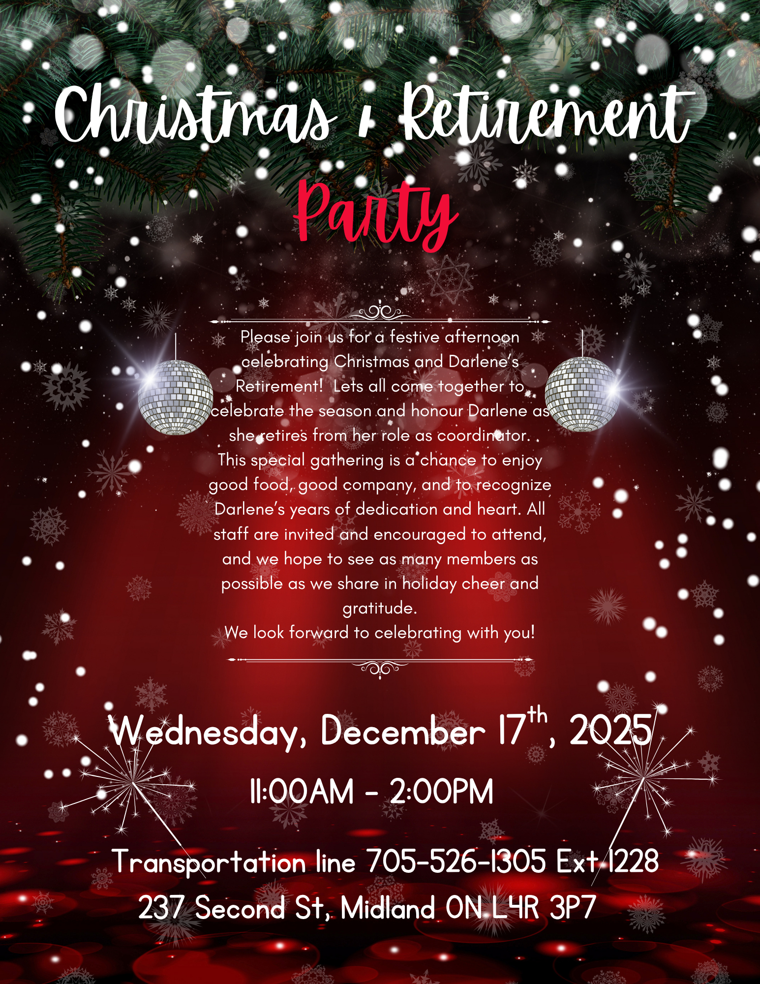 Transportation: Is provided within Midland and Penetanguishene free of charge. To arrange transportation call 705 526-1305 ext. 228 and leave your telephone number, your address, and your name at least one hour before the club opens.